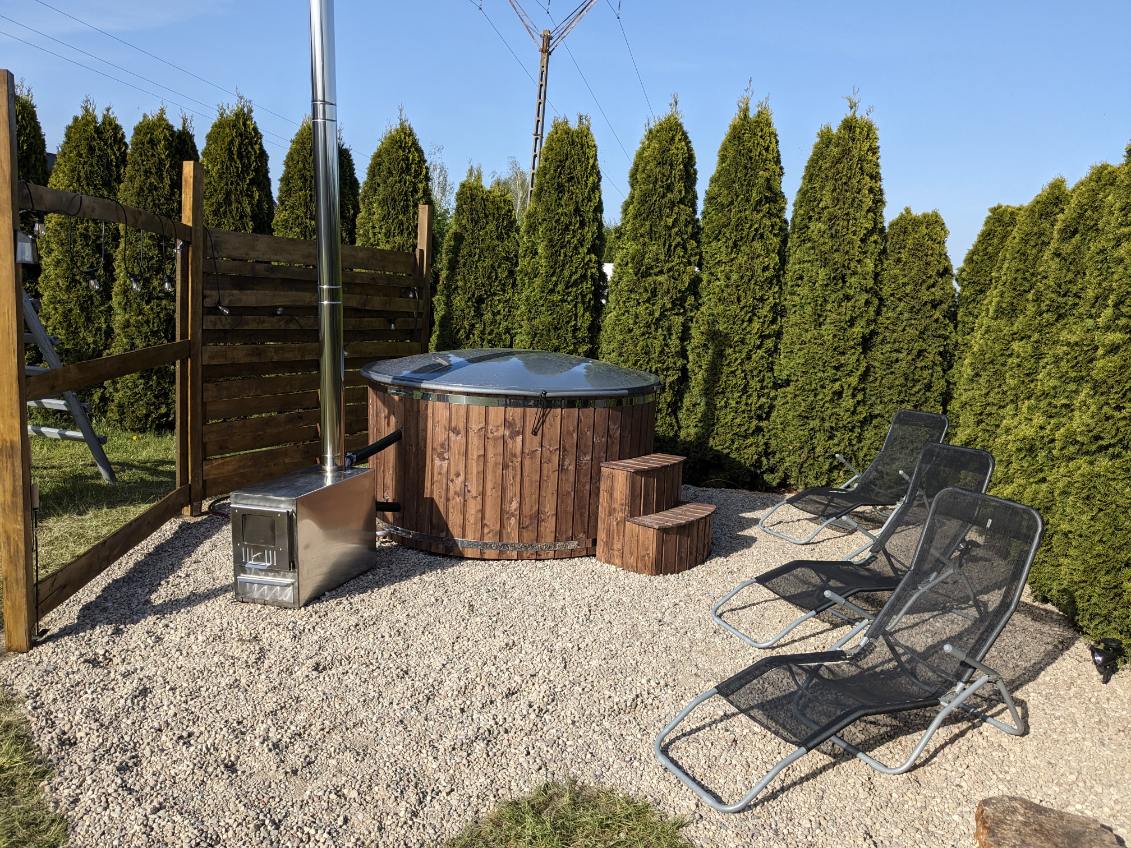 W ogrodzie mamy plac zabaw i huśtawki dla dorosłych. Dla relaksu ciała i duszy gorąca balia z hydromasażem. Klimatycznie oświetlona nocą, idealnie uzupełni miły wypoczynek. Malowniczy widok z okna sypialni umili początek dnia . A może poranna kawa na wieży obserwując żaglówki na wodzie i słuchając odgłosów natury.